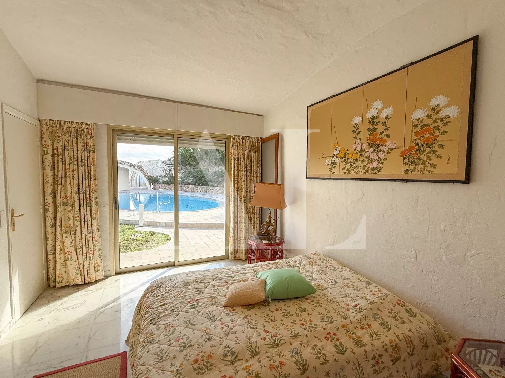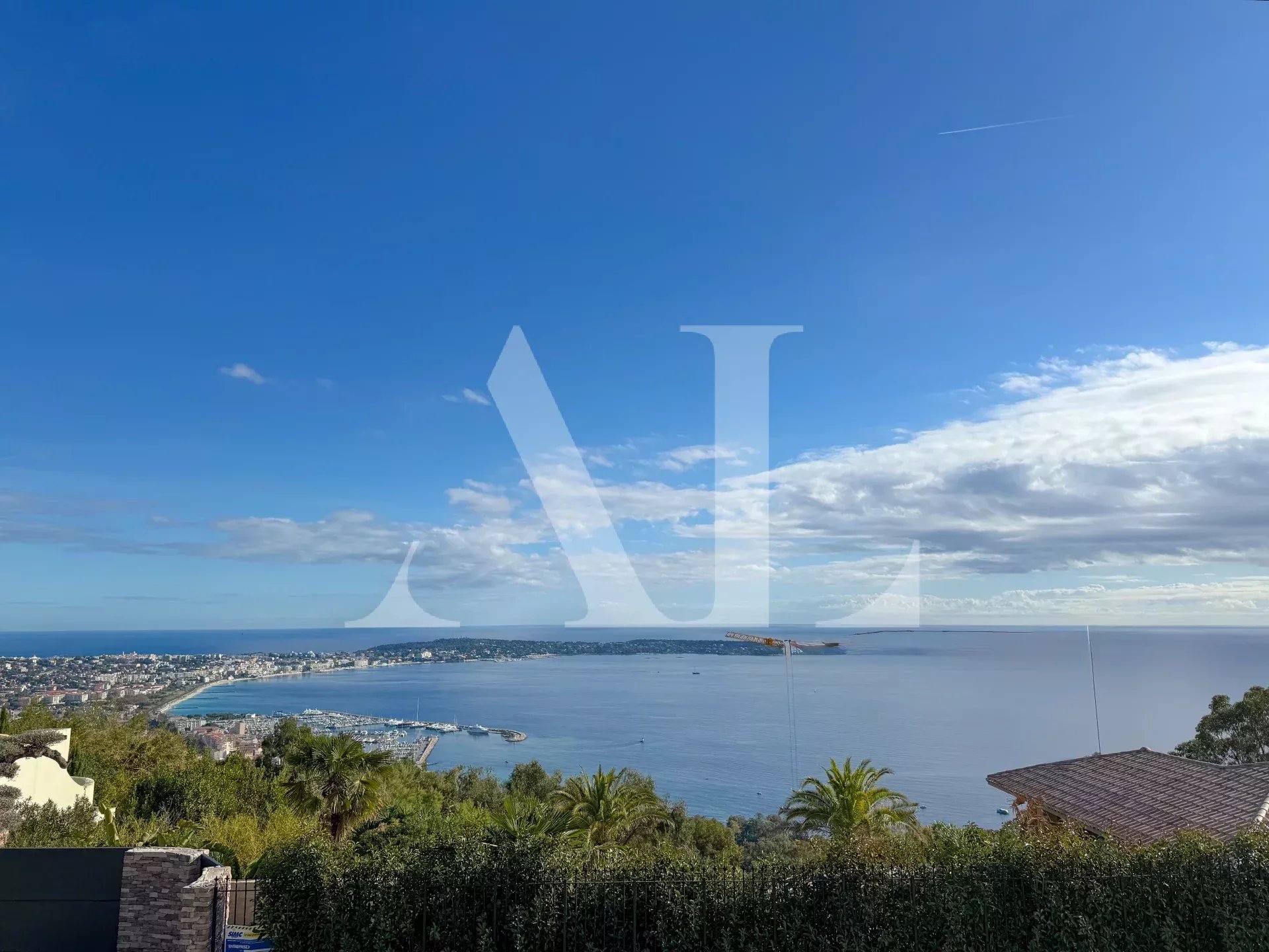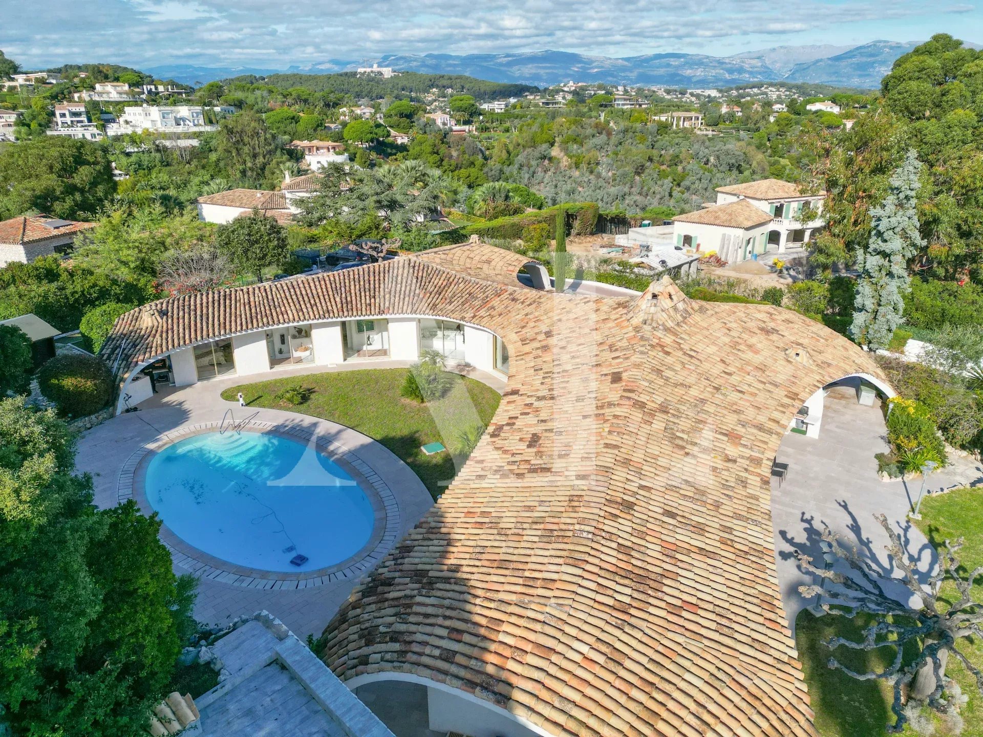 In the heart of the sought-after Super-Cannes residential area, this villa with its unique design enjoys a commanding position with breathtaking views stretching from the sea to the mountains. An entrance hall leads to a living room, dining room, kitchen, pantry, master suite, a wing with three bedrooms, two bathrooms, and a relaxation area. There is also a separate office. A pool house and a secluded infinity pool complete the property. The basement includes several storage areas, a laundry room, and a wine cellar. A separate three-room caretaker's cottage is connected to the main villa via the basement.